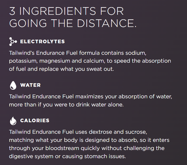 Tailwind Endurance Fuel sử dụng Dextrose và Sucrose, phù hợp với nhu cầu hấp thụ của cơ thể, nó nhanh chóng thẩm thấu vào máu mà không gây ảnh hưởng đến hệ tiêu hóa hoặc gây ra các vấn đề dạ dày