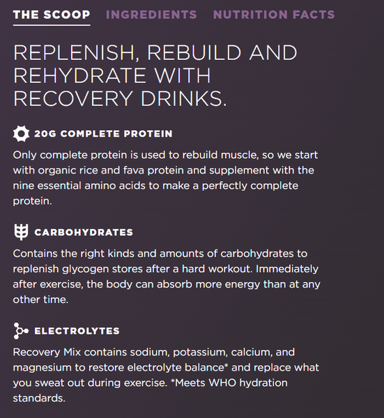 Recovery Mix chỉ có protein hoàn chỉnh mới được sử dụng để tái tạo cơ bắp, vì vậy chúng tôi bắt đầu với protein gạo hữu cơ và đậu fava, sau đó bổ sung chín loại axit amin thiết yếu để tạo ra nguồn protein hoàn chỉnh.